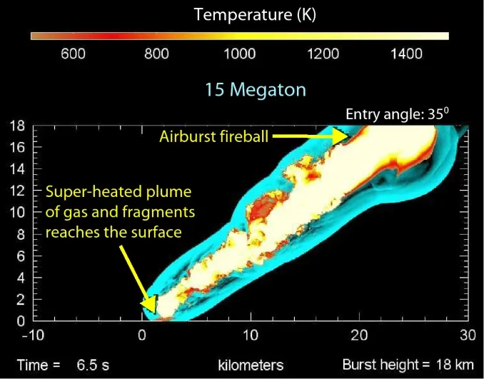 ... a high-temperature jet of ionized gases and impactor fragments reaches Earth’s surface at high velocity, excavates unconsolidated sediment, and expands radially outward in what is sometimes called a ‘base surge’.