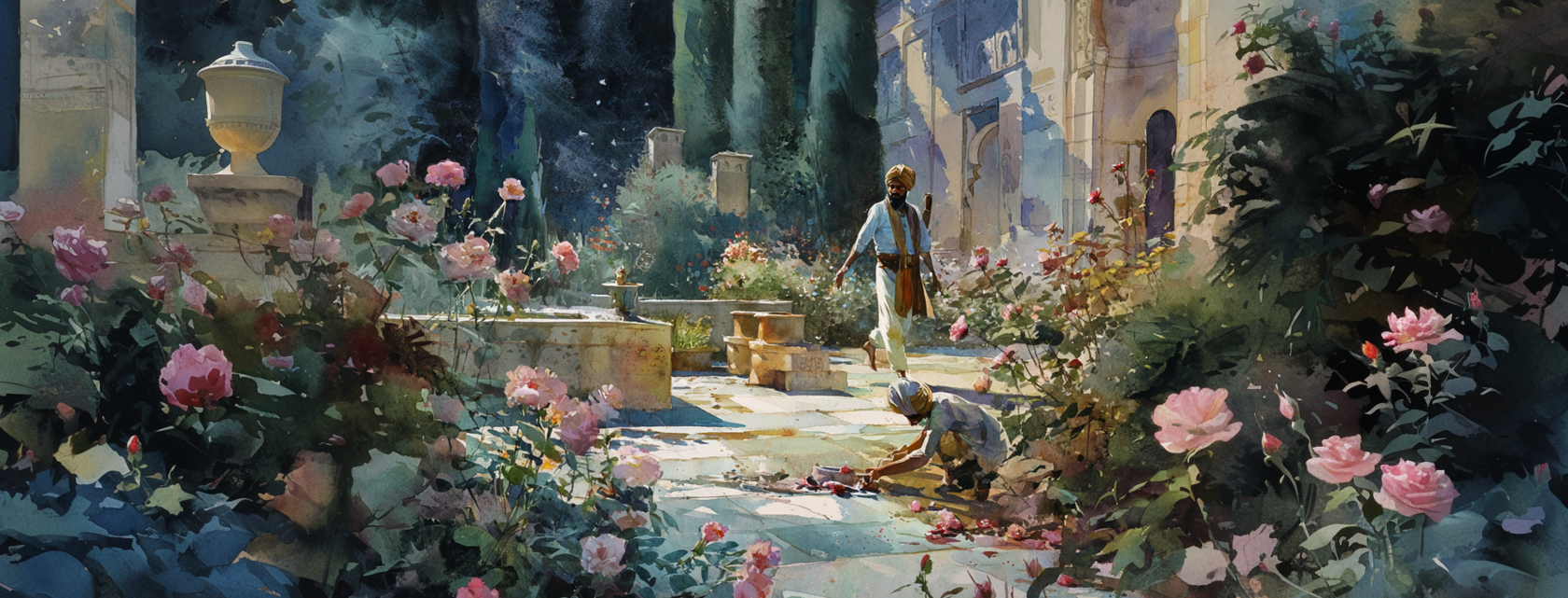 The King is enraged. To blow off steam, he leaves the scene to stroll through his palace garden.