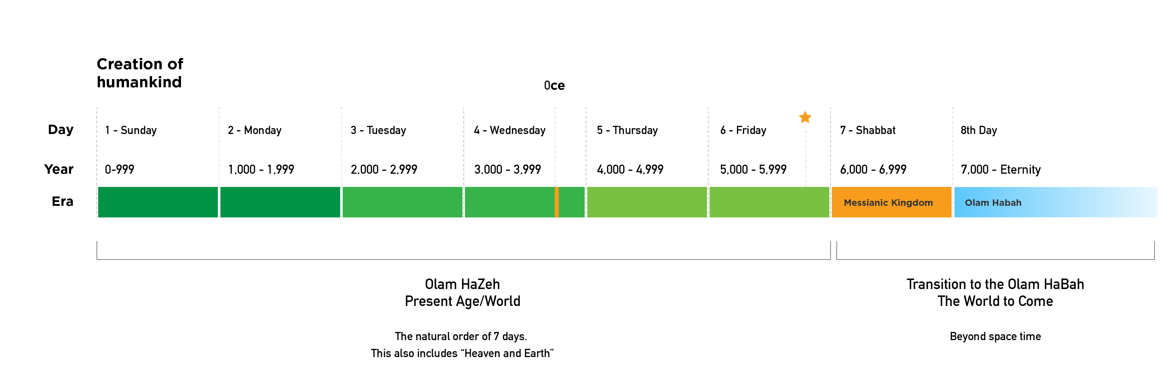This formula is modeled in the weekly counting of days, where the 6 days of work culminate in the Shabbat. So too, the 6th millennium will also end in a great 1,000-year-long Shabbat - also known as the Messianic Era.