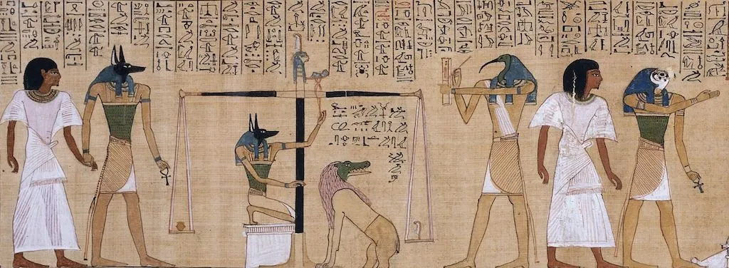 There, Osiris and a jury of forty-two assessors would place the heart of the deceased on a set of scales. On one side of the scales, the person's heart. On the other, a single feather.